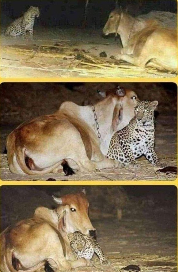 The leopard came at night to visit the cow that fed him after his mother died.