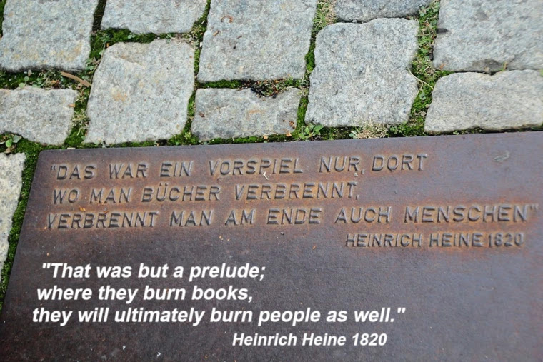 Memorial plaque at Bebelplatz, Berlin (Germany) The Bebelplatz is known as the site of one of the infamous Nazi book burning ceremonies held on the evening of 10 May 1933 in many German university cities. The quote above is taken from an 1821 play by Heinrich Heine called “Almansor”. In the play itself, the quote is referring to the burning of the Muslim Quran by the Christian Inquisition in Spain.